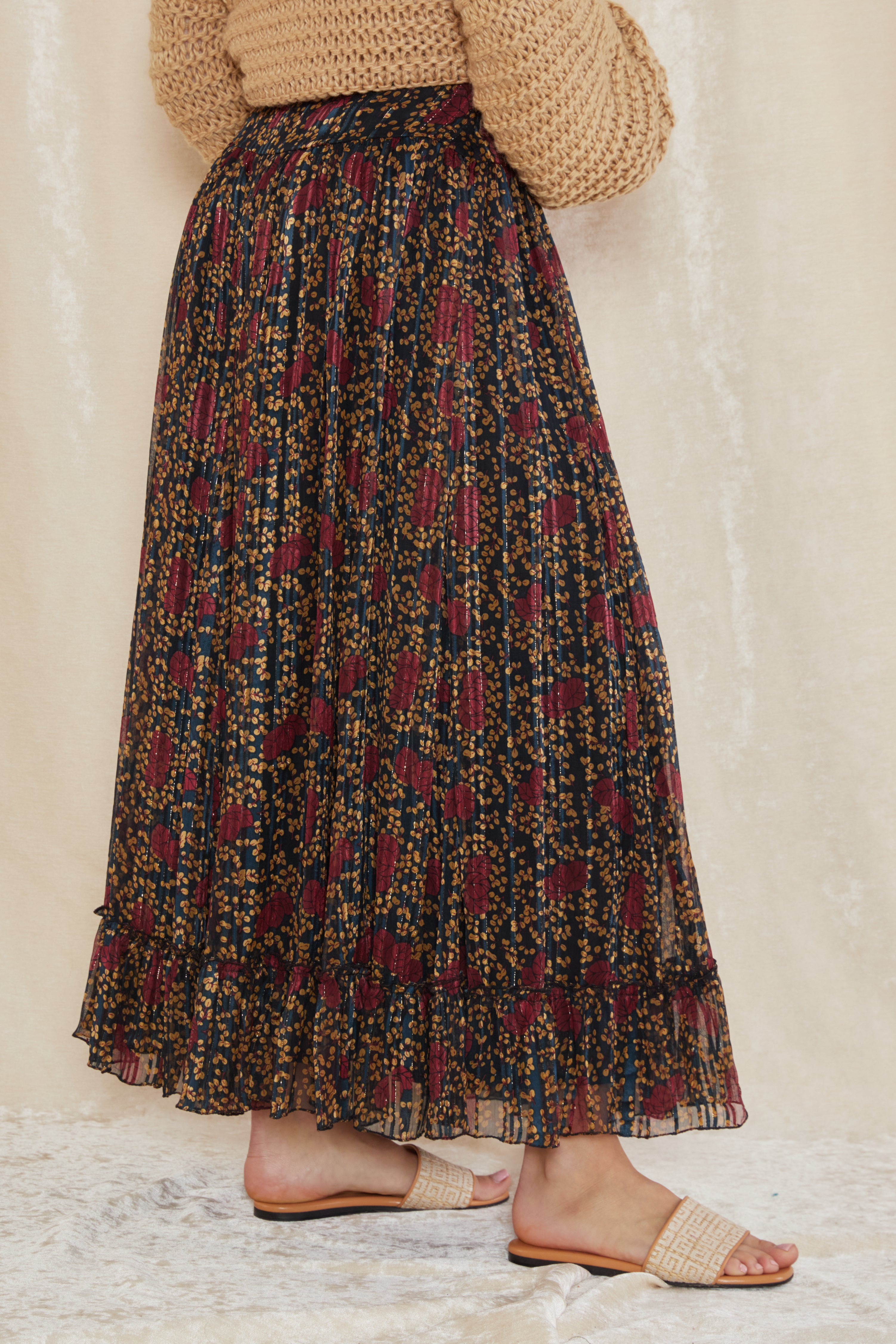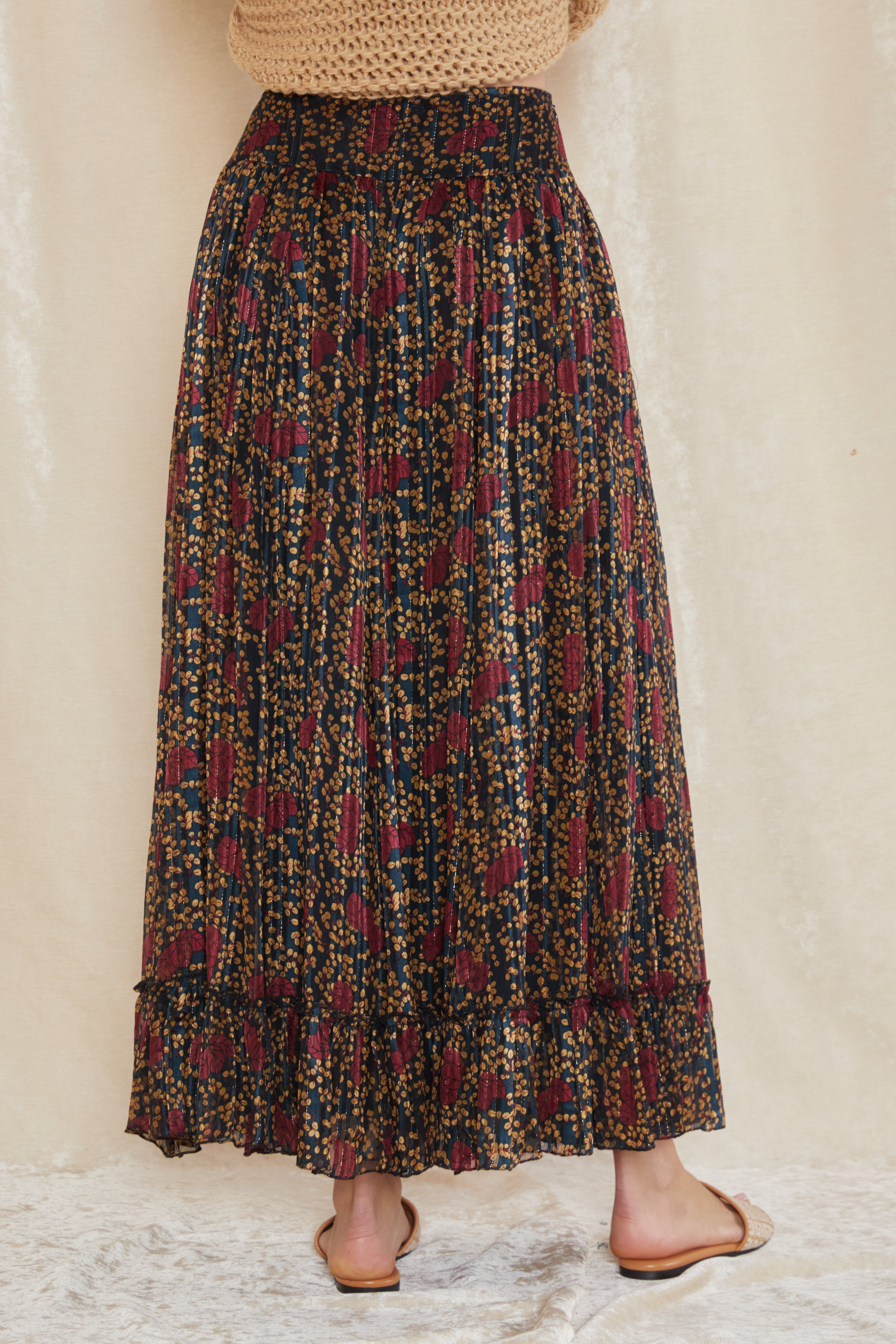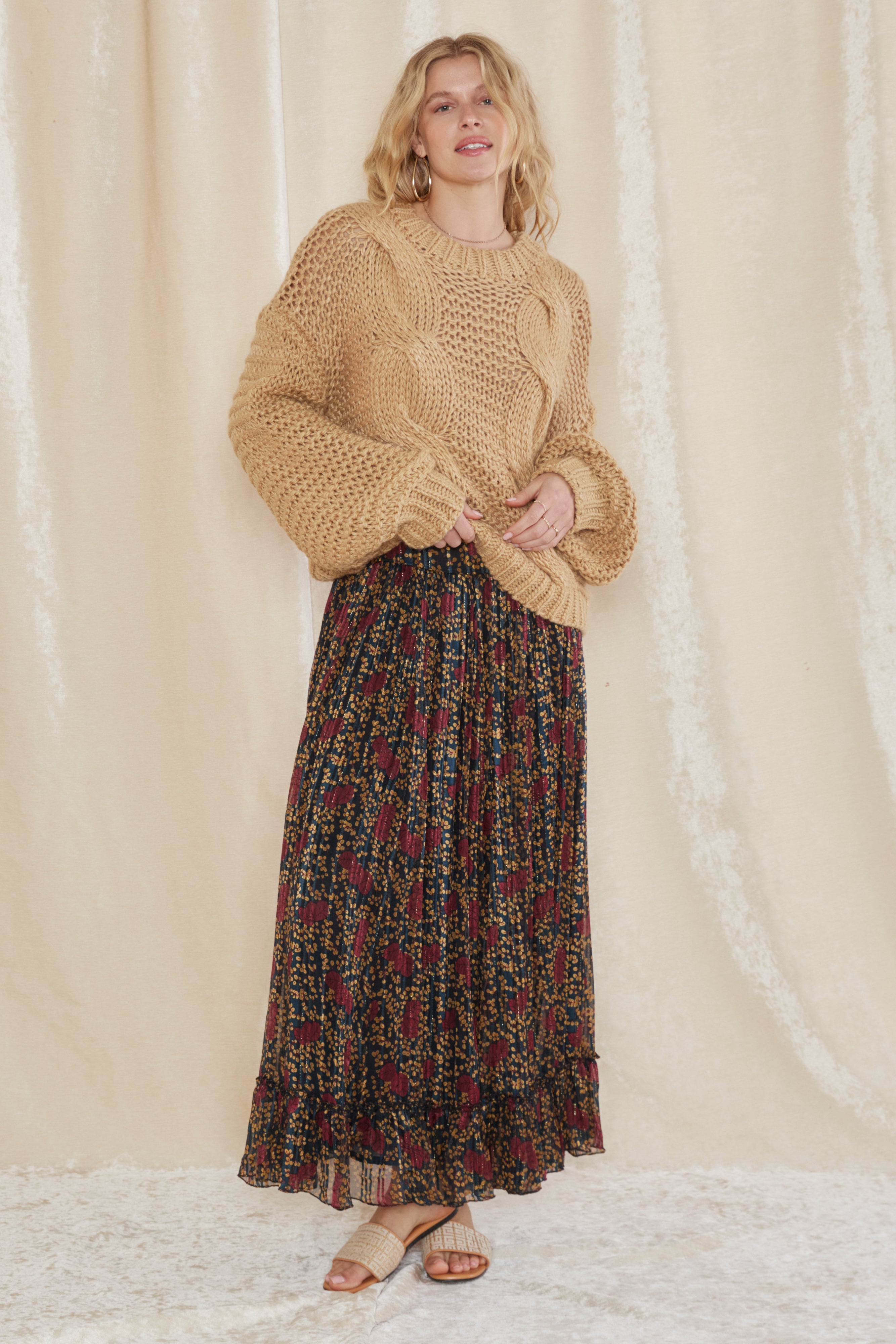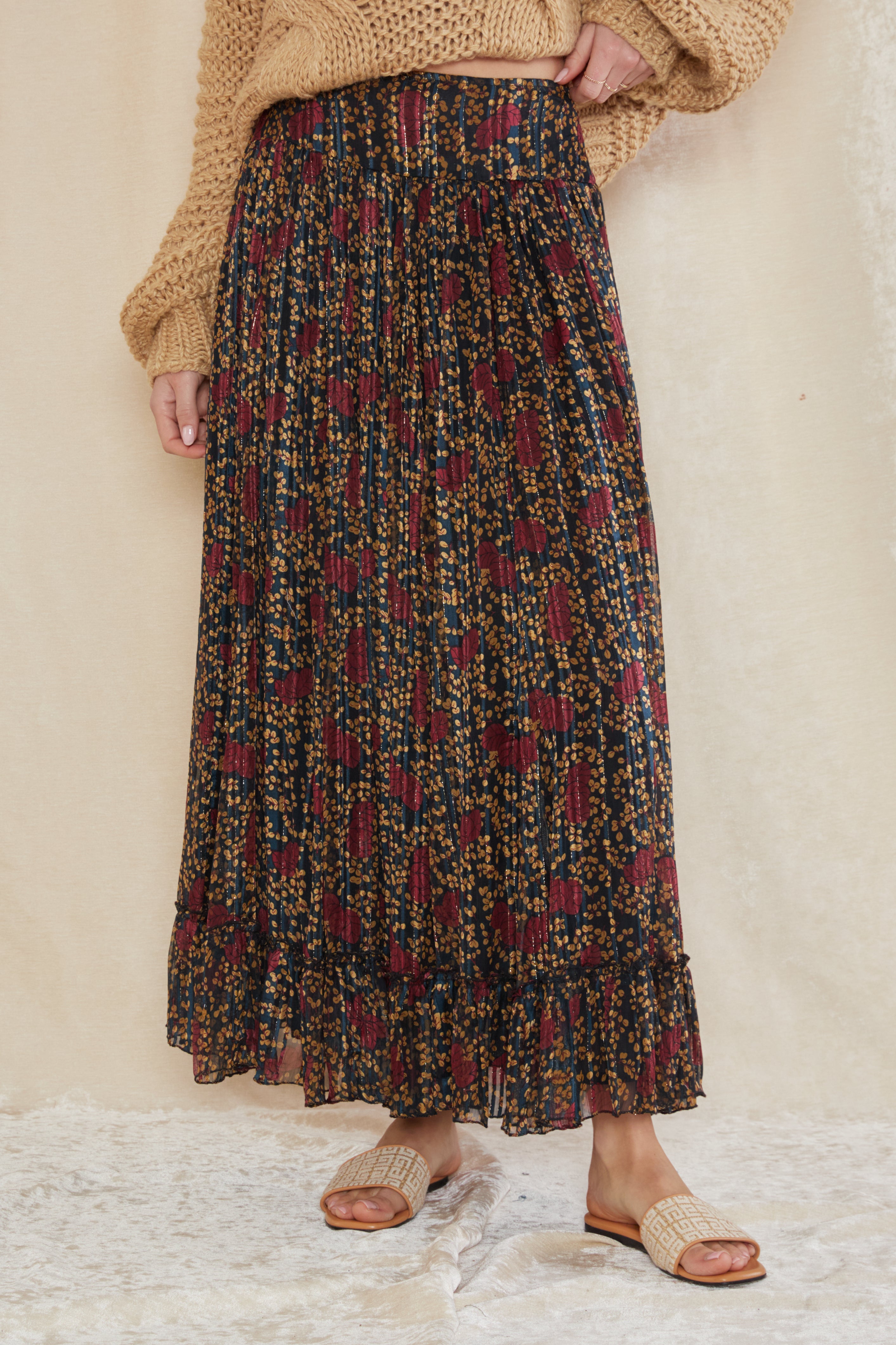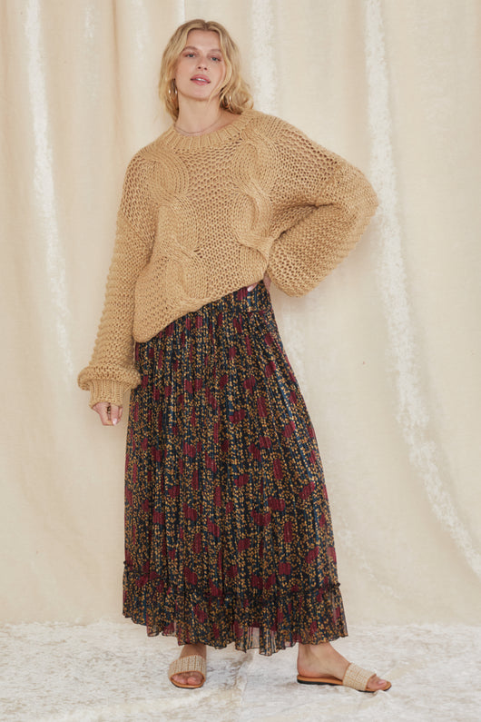 The Uma Maxi Skirt features a beautiful metallic floral print and elastic waist. Wear with our Alaska Cable Knit sweater and ballet flats or pair with your favorite knee high boots for a high fashion look!