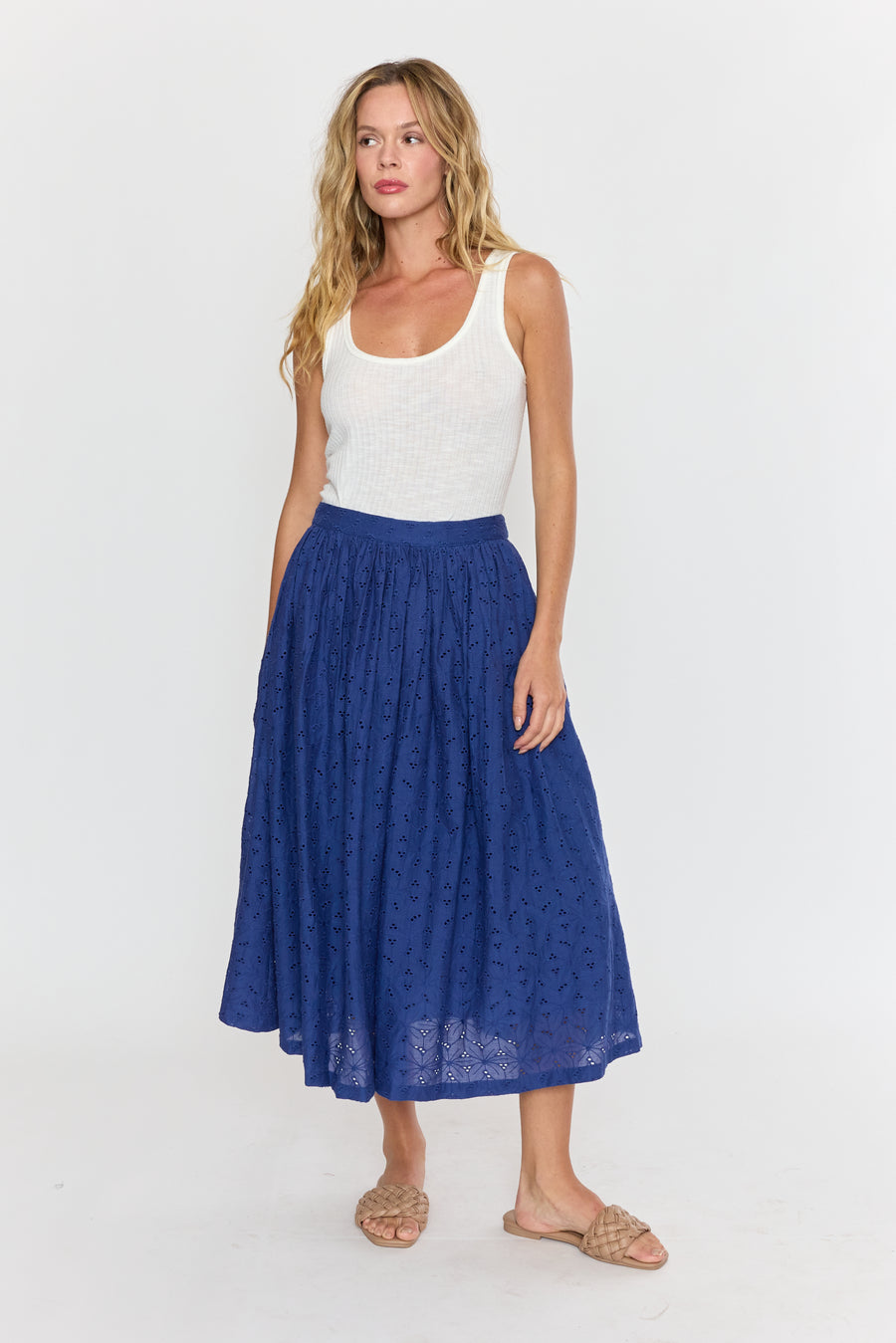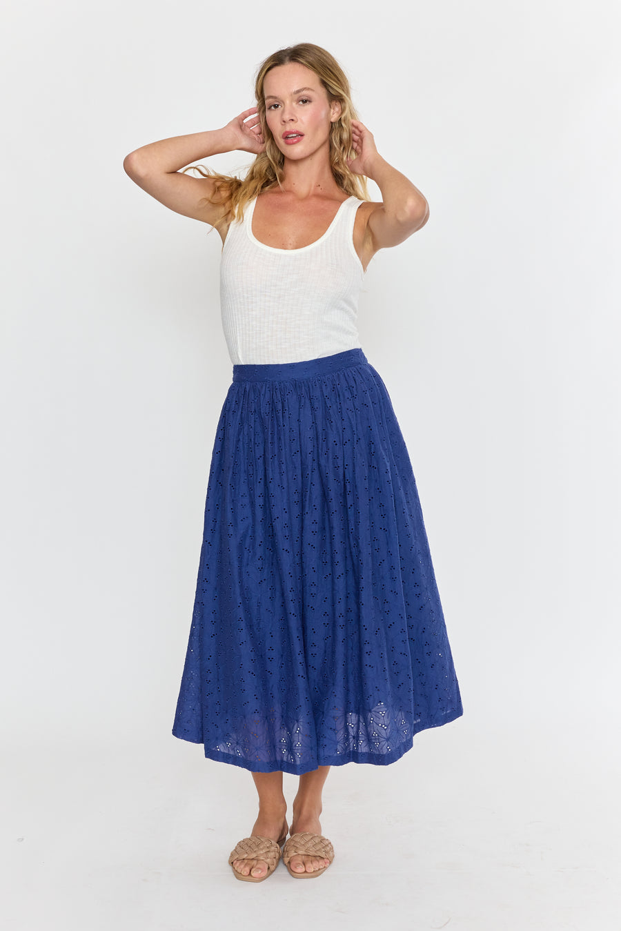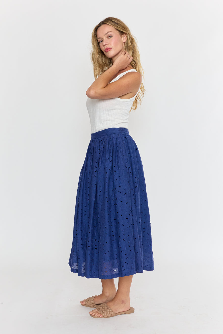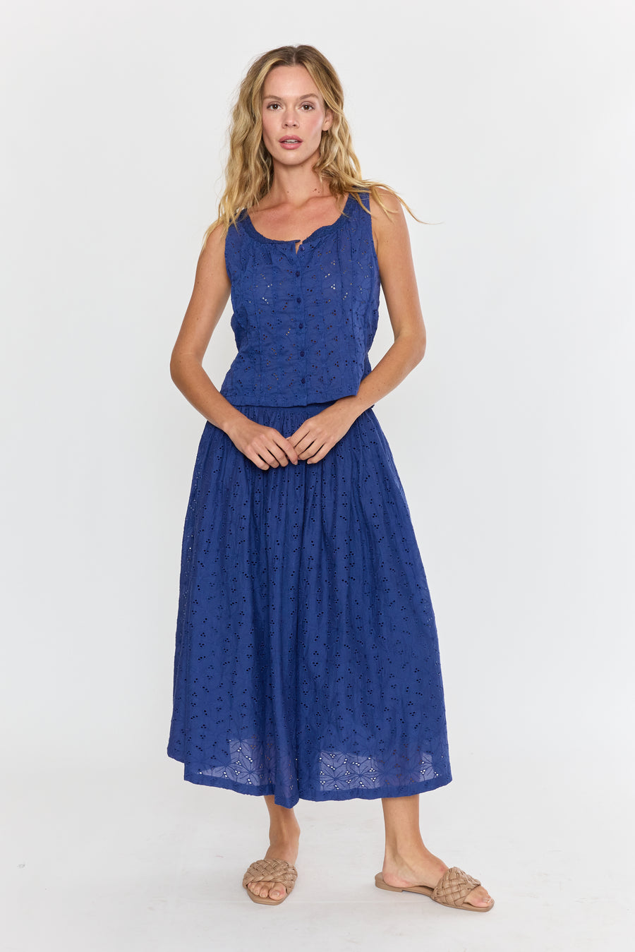 The Venna Midi Skirt brings summer vibes to life with its charming eyelet fabric in a stunning blue hue. Light and breezy, it’s perfect for sunny days and playful adventures, adding a fresh pop of color to your wardrobe. Embrace effortless style and comfort all season long!