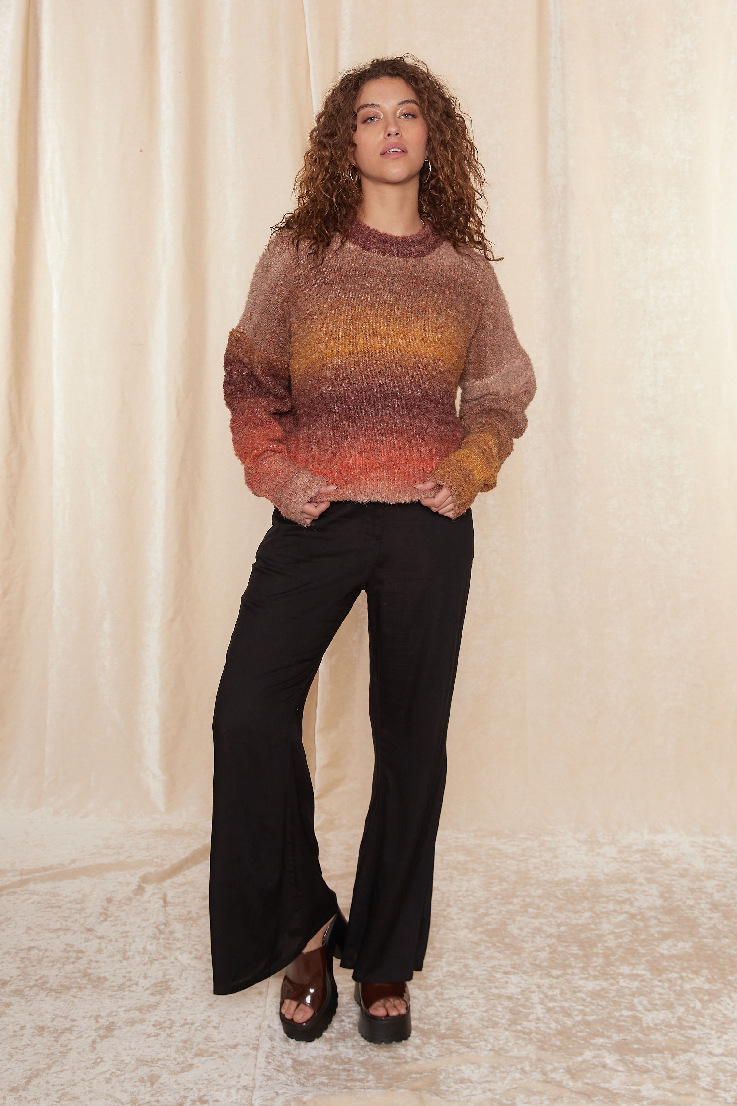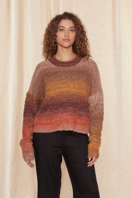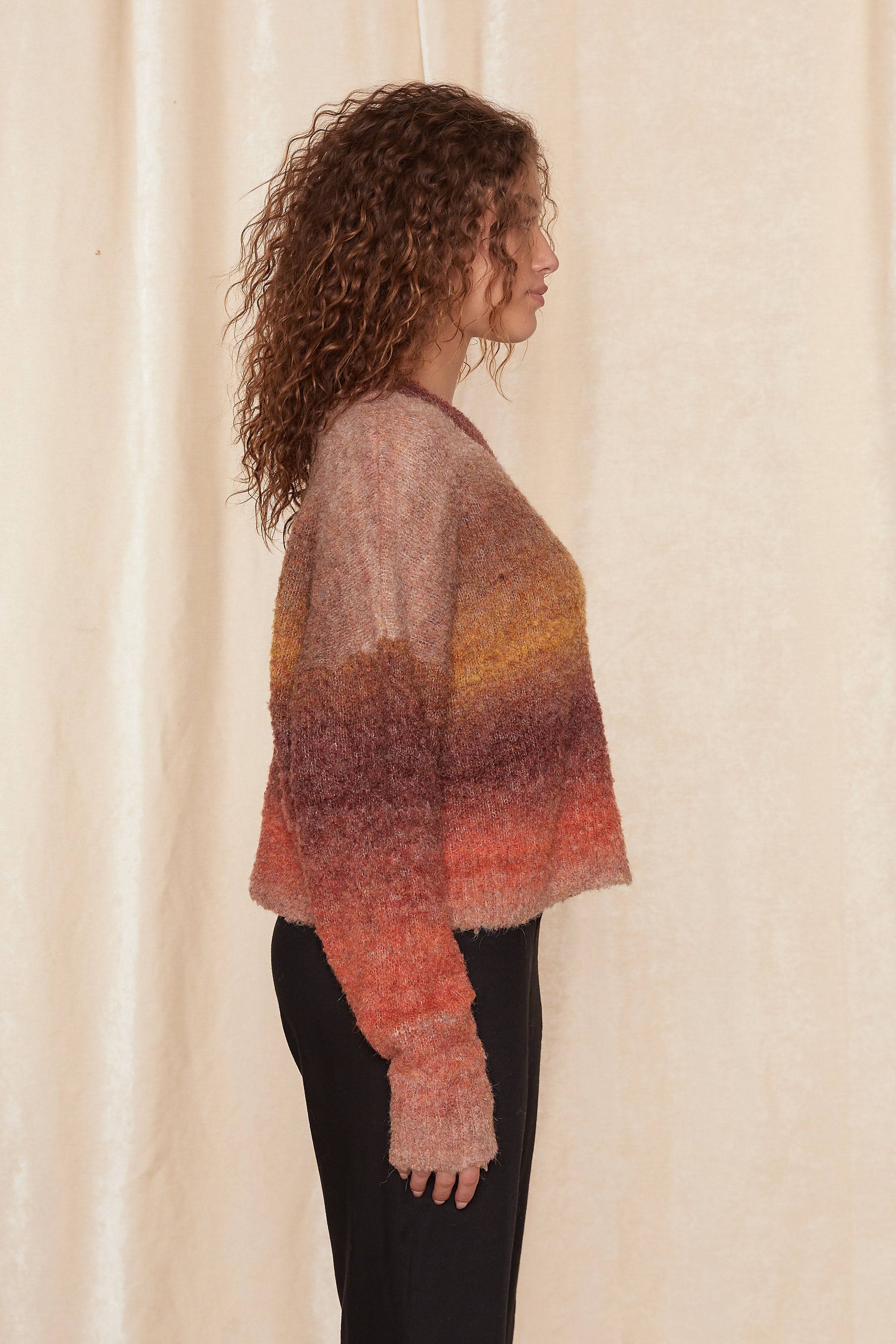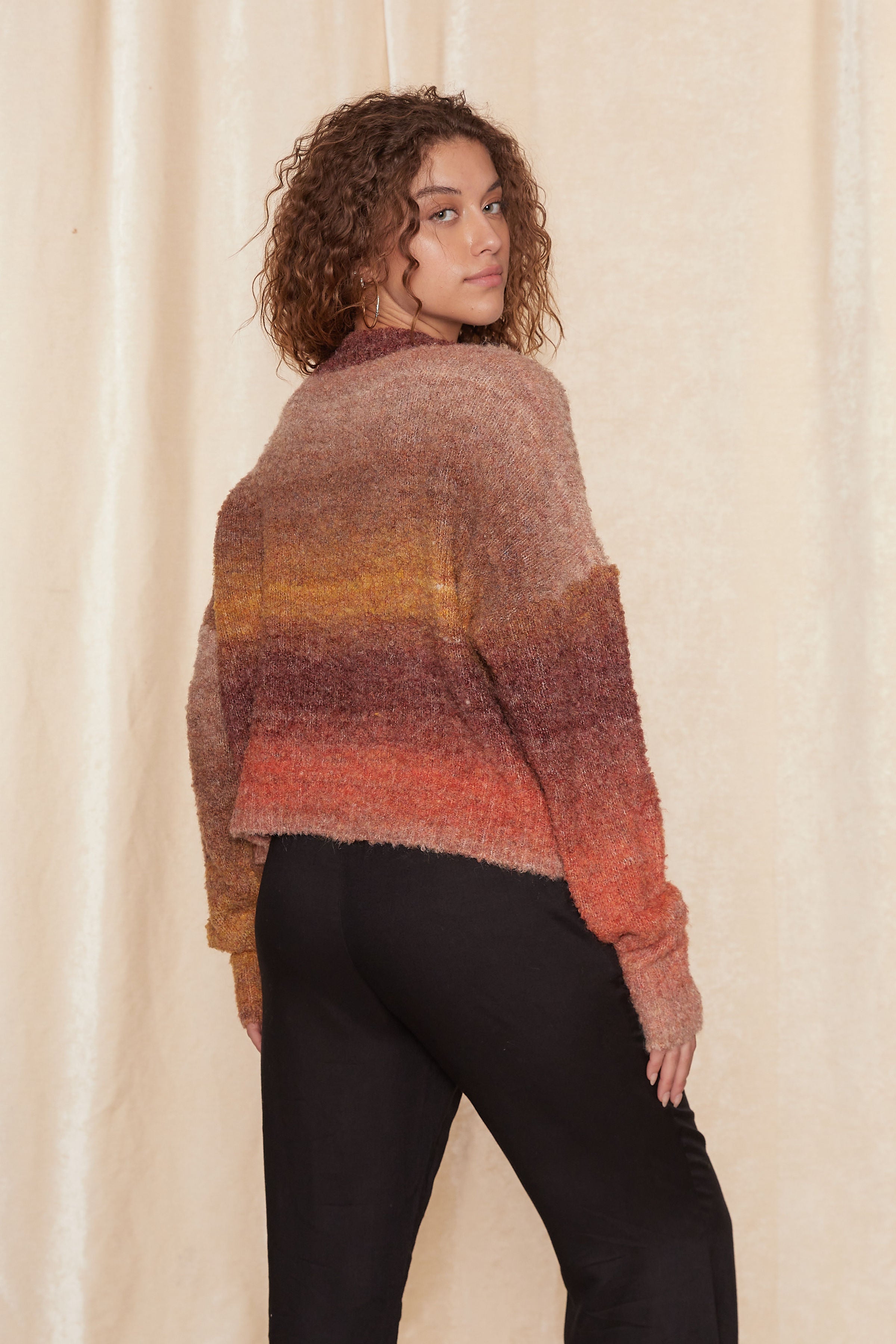 Drop shoulder stitches created a casual and cozy fit. Beautiful ombre colors on this soft fabric creates a dreamy combination.